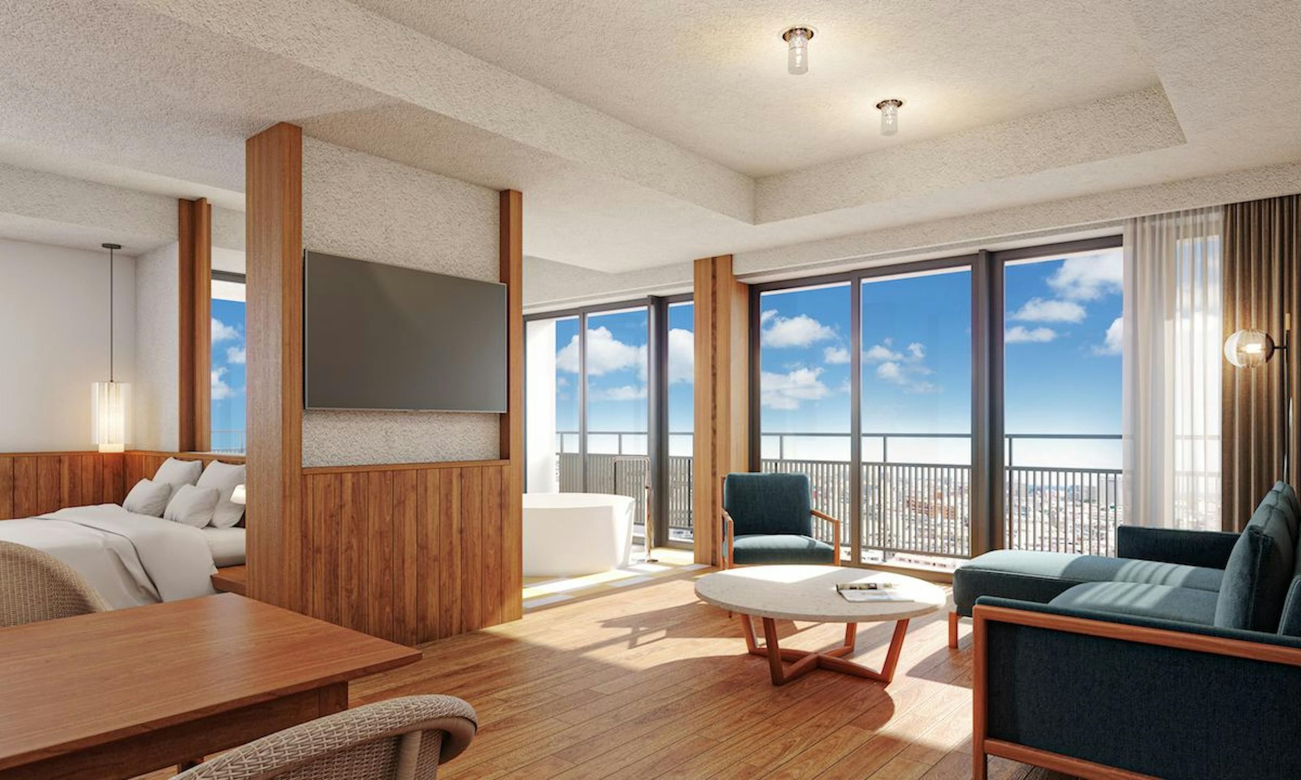 全部屋44㎡以上の5タイプ88室、⾼層階から那覇の街を⼀望できる屋内プール、沖縄産⾷材をふんだんに使⽤するイタリアン、和⾷、鉄板焼、サンセットバーなど計4つのレストランを備えます。